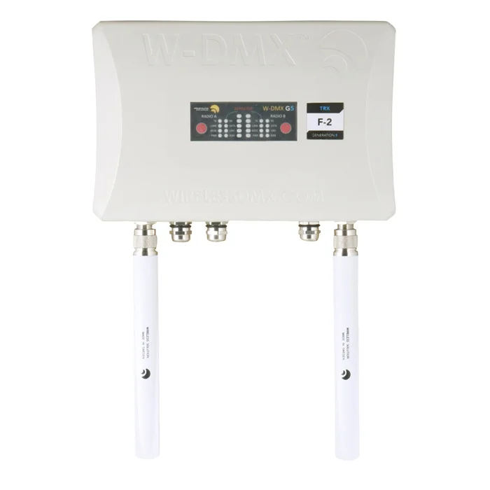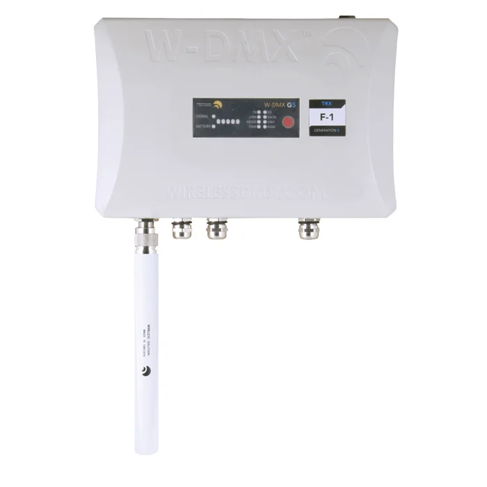 De W-DMX™ WhiteBox Transceivers zijn de perfecte weerbestendige oplossing voor Wireless DMX-signaaloverdracht als onderdeel van ons architectuur-/buitenportfolio. De G5 ondersteunt zowel DMX- als RDM-signalen voor 2,4 GHz, 5,2 GHz en 5,8 GHz, waardoor er meer kanalen beschikbaar zijn en hij uiterst betrouwbaar is. Dankzij de stevige behuizing met IP66-classificatie is de Whitebox-serie goed bestand tegen alle weersomstandigheden. Verkrijgbaar als F-1 G5 met 1 universe of F-2 G5 met twee universes
